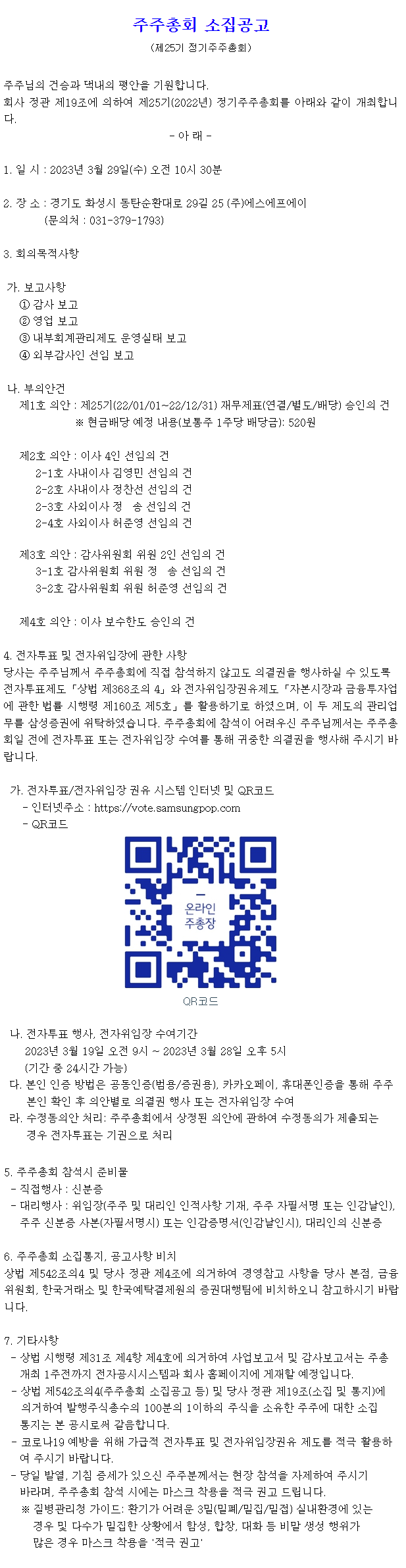 제25기 주주총회 개최: 2023년 3월 29일(수) 오전 10시 30분