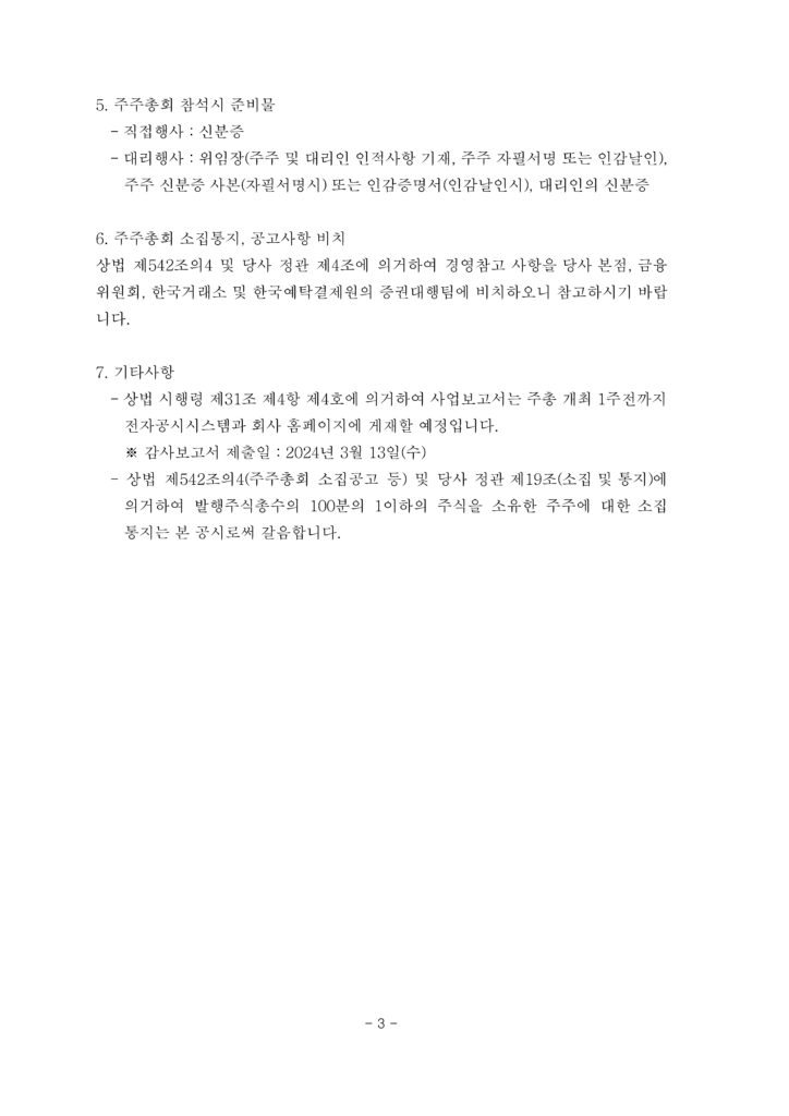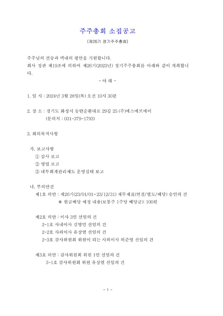 제26기 주주총회 개최: 2024년 3월 28일(목) 오전 10시 30분