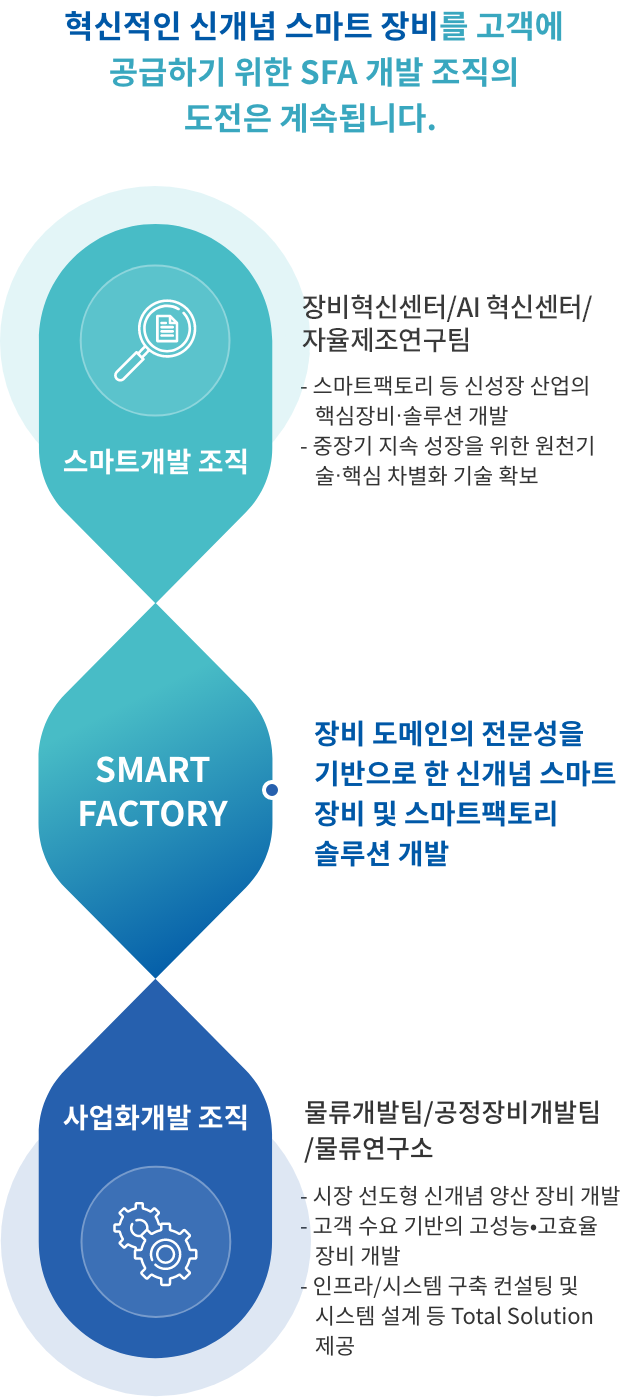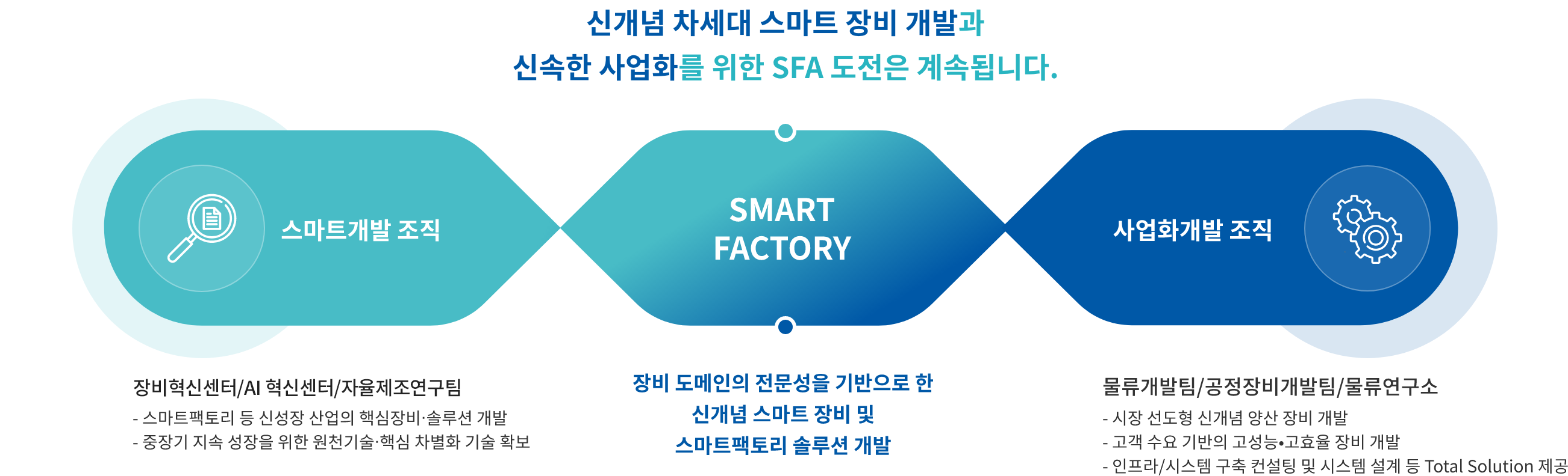 SFA가 보유한 장비 업계 최대 규모의 개발 조직들은 장비업계 최고의 Domain Knowledge와 스마트팩토리 솔루션이 결합된 신개념 장비 개발과 사업 진출에 개발 역량을 집중하고 있습니다.